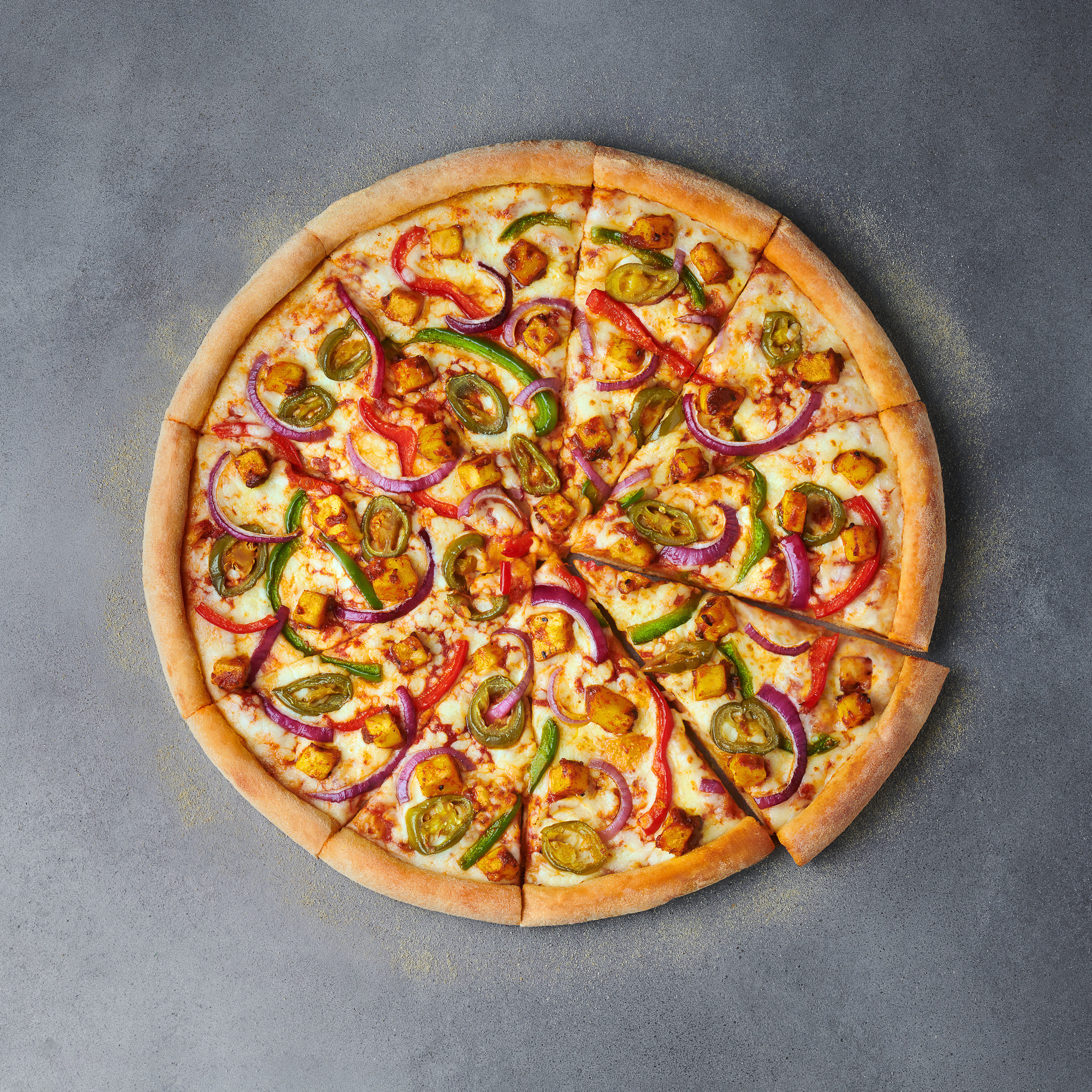 Masala-spiced paneer pieces, green & red peppers, green jalapeños, red onion and mozzarella on our signature tomato sauce base.